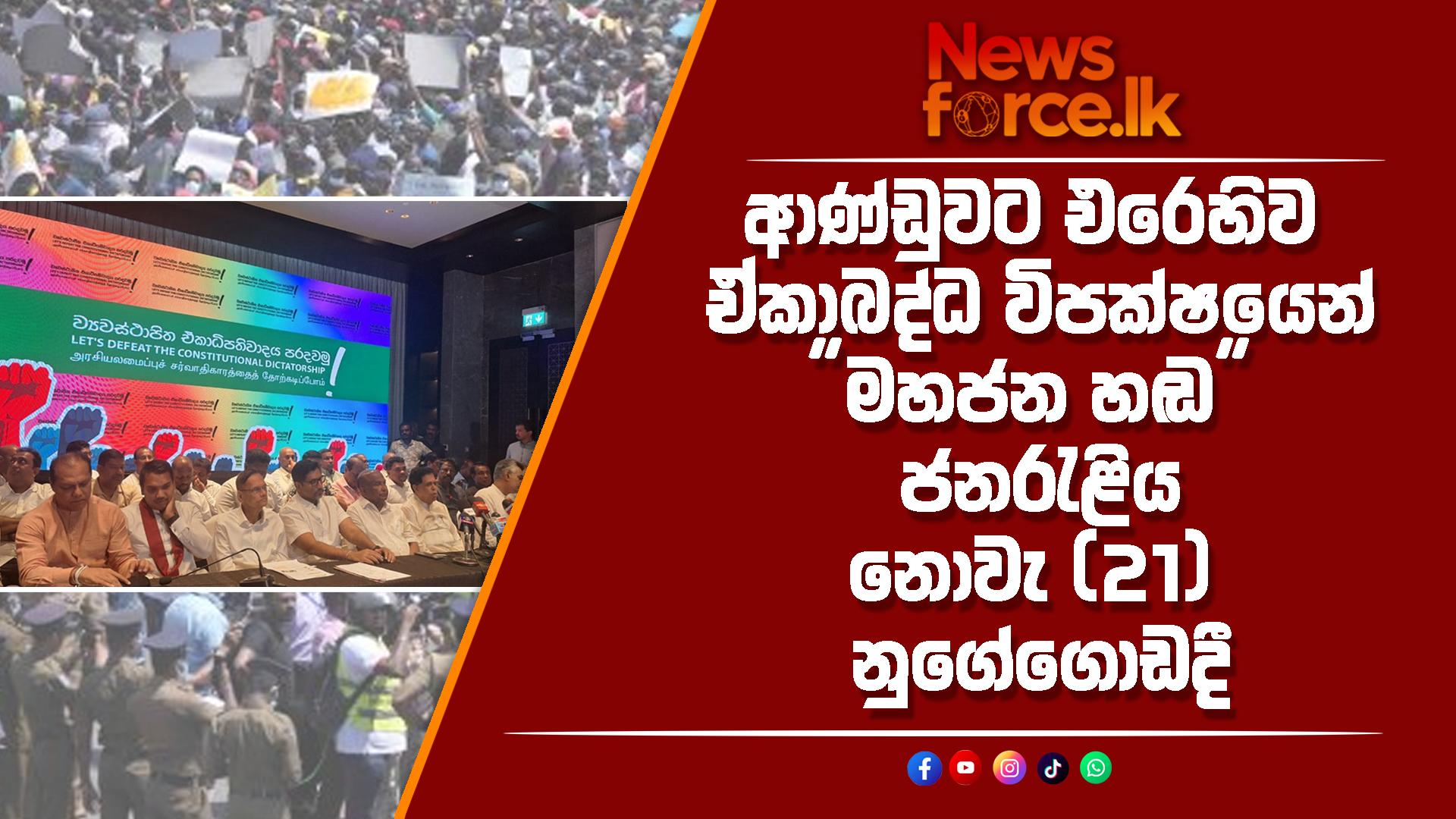 ආණ්ඩුවට එරෙහිව විරුද්ධ පක්ෂය ඒකාබද්ධව පවත්වනු ලබන ජනරැළිය “මහජන හඬ” නමින් නොවැම්බර් 21 වැනි දා සවස 2.00ට නුගේගොඩදී පැවැත්වීමට තීරණය කර ඇති බව වාර්තාවනවා.