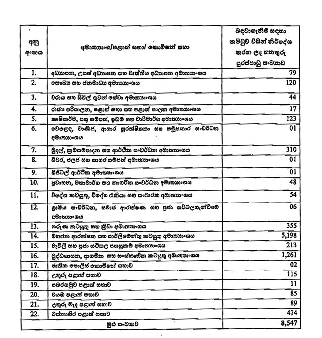 ඒ අනුව ඒ ඒ අමාත්යාංශ විසින් එම අමාත්යාංශ යටතේ පවතින දෙපාර්තමේන්තු සහ අනෙකුත් ආයතනවල පවතින තනතුරු පුරප්පාඩු සම්පූර්ණ කිරීම සඳහා ඉදිරිපත් කරන ලද ඉල්ලීම් සැලකිල්ලට ගෙන, ඔක්තෝබර් 02 වන දින පැවති අමාත්ය මණ්ඩල රැස්වීමේ දී කරනු ලැබ ඇති නිර්දේශ පරිදි පහත සඳහන් බඳවාගැනීම් සිදුකිරීම සඳහා අදාළ අමාත්යාංශ සහ ආයතන වෙත අනුමැතිය ලබාදී ඇත.