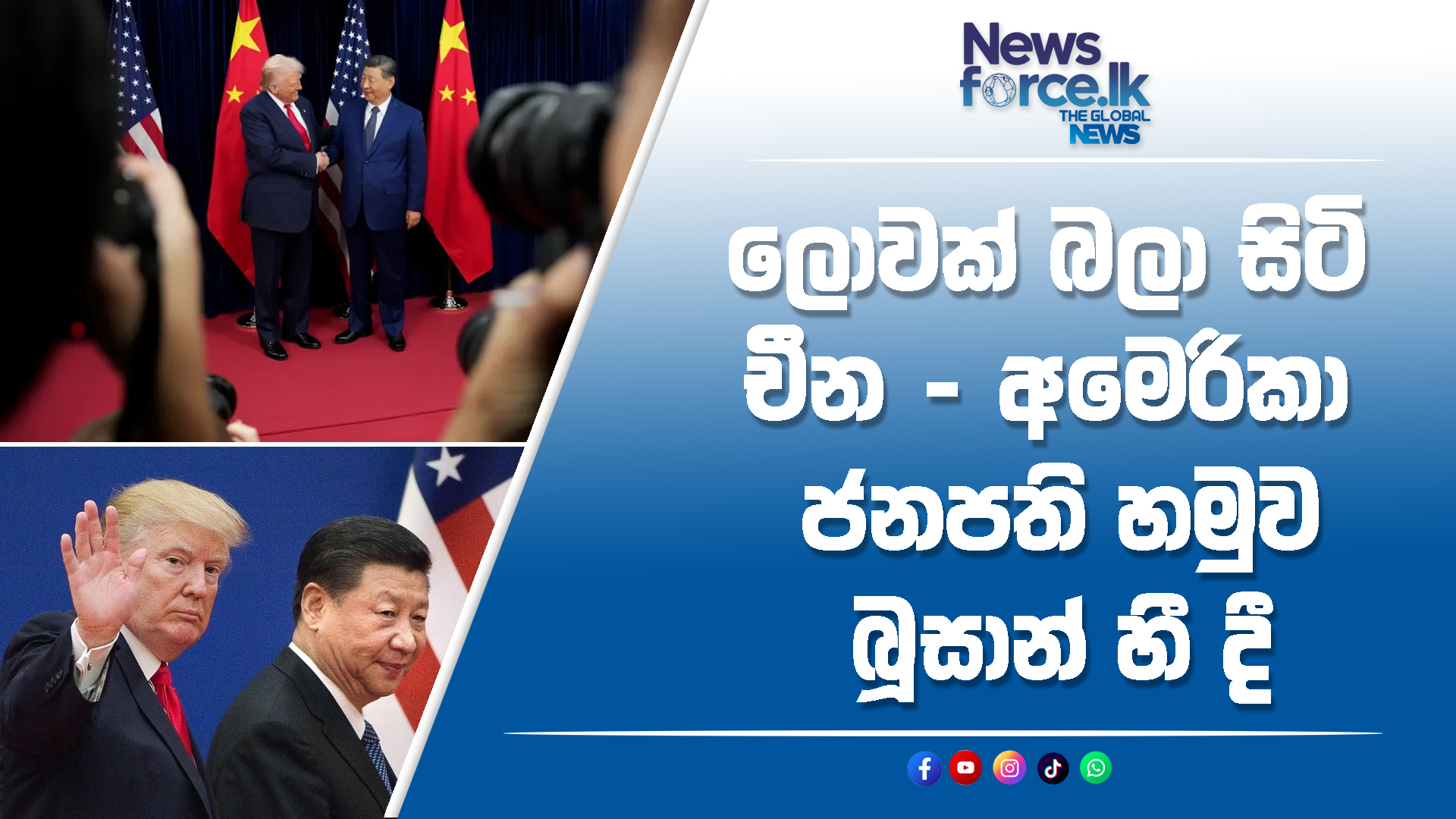 චීන ජනාධිපති ෂී ජින්පිං සහ අමෙරිකානු ජනාධිපති ඩොනල්ඩ් ට්රම්ප් මහතා අතර හමුව අද (30) දකුණු කොරියාවේ Busan නගරයේදී සිදුව තිබේ.
