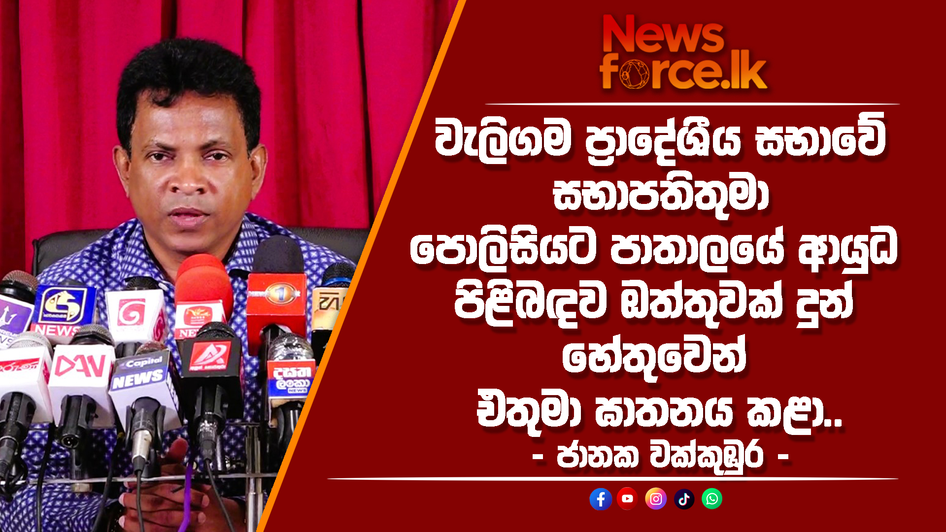 වැලිගම සභාපති පොලිසියට පාතාලයේ ආයුධ අල්ලා ගැනීමට ඔත්තුවක් ලබාදී පසුව පාතාලය විසින් ඔත්තුව ලබාදුන් වැලිගම ප්‍රාදේශීය සභාවේ සභාපති ඝාතනය කිරීමට ඔහු ඔත්තුව දුන් බව පාතාල නායකයා දැනගත්තේ කෙසේද කියා පොලිස්පතිතුමාගෙන් විමසන බව හිටපු රාජ්‍ය අමාත්‍ය ජානක වක්කුඹුර මහතා පැවසීය. ඒ මහතා මේ බව ප්‍රකාශ කළේ ශ්‍රි ලංකා පොදුජන පෙරමුණ පක්ෂ මූලස්ථානයේ අද දින (2025.10.28) පැවති ප්‍රවෘත්ති සාකච්ඡාවට එක්වෙමිනි.