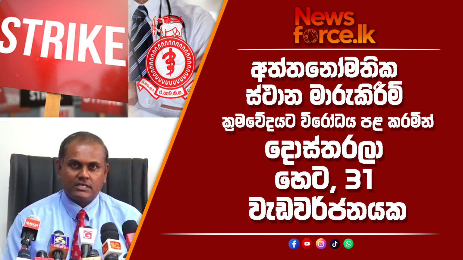 අත්තනෝමතික ස්ථාන මාරුකිරීම් ක්‍රමවේදයට විරෝධය පළ කරමින් හෙට (31) දිනයේ දීපව්‍යාප්ත වෘත්තීය සමිති ක්‍රියාමාර්ගයක් ආරම්භ කරන බව රජයේ වෛද්‍ය නිලධාරීන්ගේ සංගමය පවසයි.