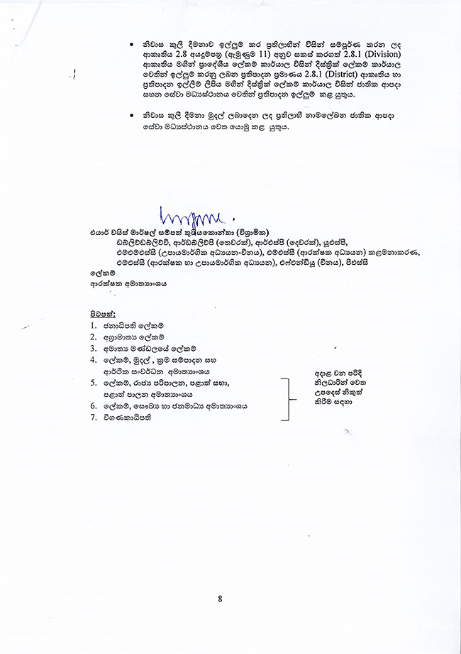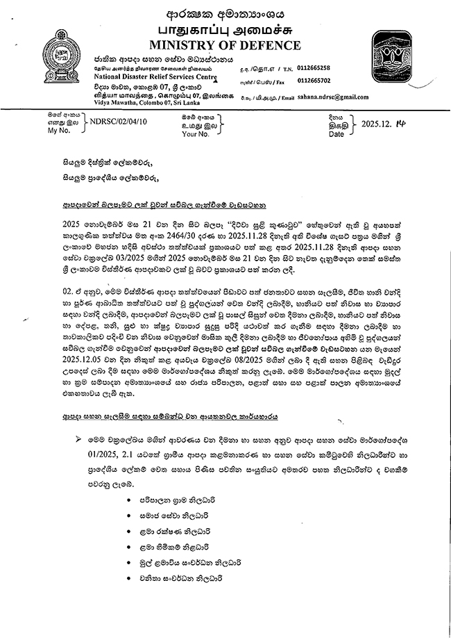 ඒ අනුව විපතට පත් ජනතාවට ආපදා සහන අරමුදල් බෙදාහැරීම සම්බන්ධයෙන් ආරක්ෂක ලේකම්වරයා විසින් දිස්ත්රික් සහ ප්රදේශීය ලේකම්වරුන් වෙත මෙම මාර්ගෝපදේශ මාලාව නිකුත් කර ඇත.