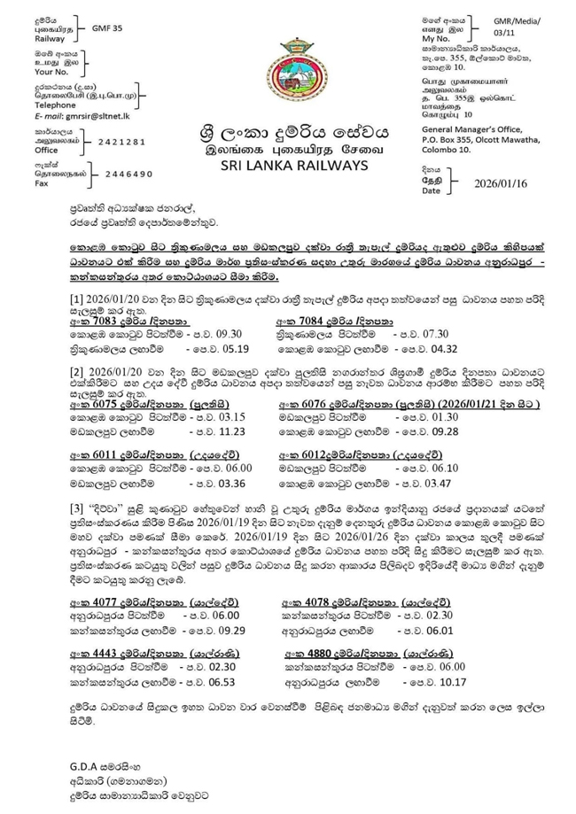 ඒ අනුව කොළඹ කොටුව සහ ත්රිකුණාමලය අතර ධාවනය වන රාත්රී තැපැල් දුම්රිය ජනවාරි 20 වනදා සිට යළි ධාවනයට එක්කිරීමට සැලසුම් කර ඇත.