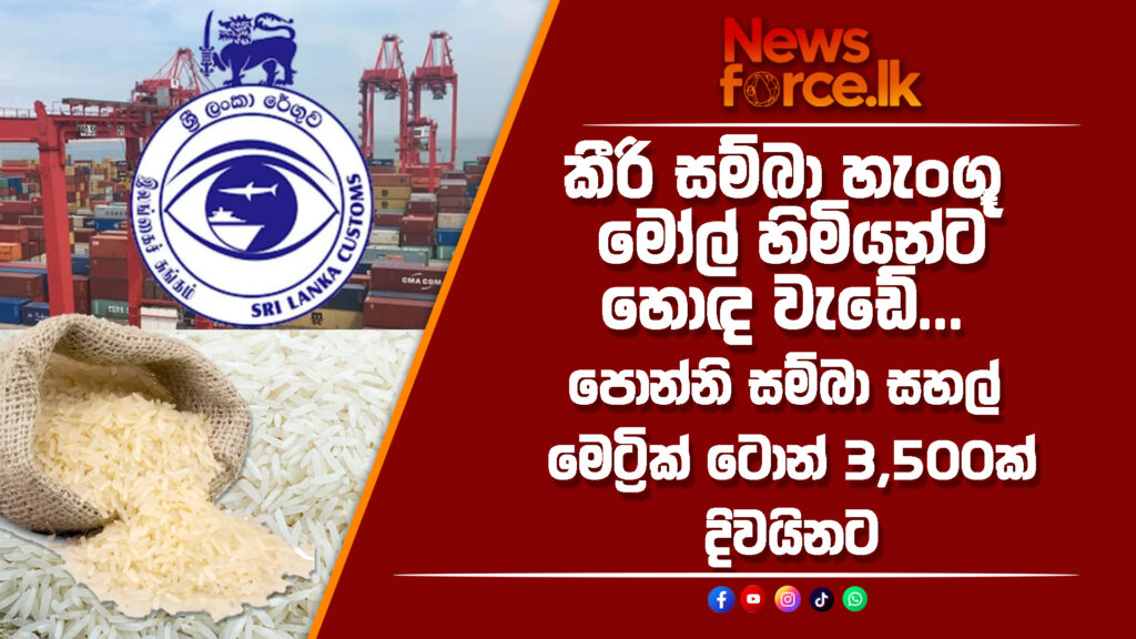 දේශීය වෙළෙඳ පොළේ පවතින කීරි සම්බා සහල් හිඟයට පිළියමක් ලෙස මේ වන විට පොන්නි සම්බා සහල් මෙට්රික් ටොන් 3,500ක ප්රමාණයක් දිවයිනට ආනයනය කර ඇති බව ශ්රී ලංකා රේගුව පවසයි.