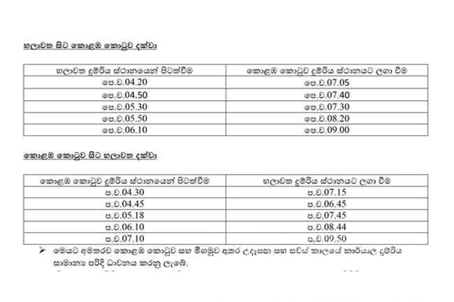 එමෙන්ම මීට අමතරව කොළඹ කොටුව සහ මීගමුව අතර අතර උදෑසන සහ සවස් කාලයේ දුම්රිය සාමාන්ය පරිදි ධාවනය වන බවත් දුම්රිය දෙපාර්තමේන්තුව පැවසීය.