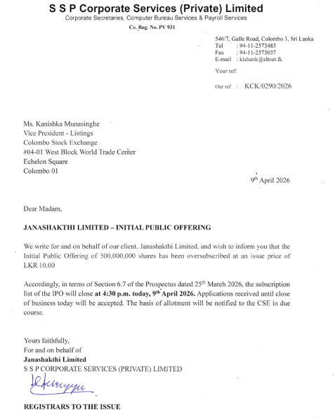 අද (09) දිනයේ දී විවෘත කෙරුණු ජනශක්ති ලිමිටඩ් හි මූලික මහජන කොටස් නිකුතුව සඳහා අධිදායකත්වයක් ලැබී ඇති බව මෙම නිකුතුවේ රෙජිස්ට්රාර් සමාගම වන SSP Corporate Services විසින් කොළඹ කොටස් වෙළෙඳපොළ වෙත දැනුම් දී සිටී.