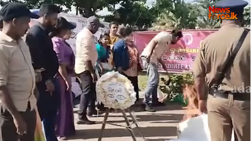අද (27) පෙරවරුවේ ඔවුන් “යුක්තියේ මළගම” ලෙසින් පෙට්ටියක් පුළුස්සා දැමූ අතර පොලිසිය ප්‍රකාශ කළේ එය කඩිනමින් ඉවත් කර ගන්නා ලෙසය.
