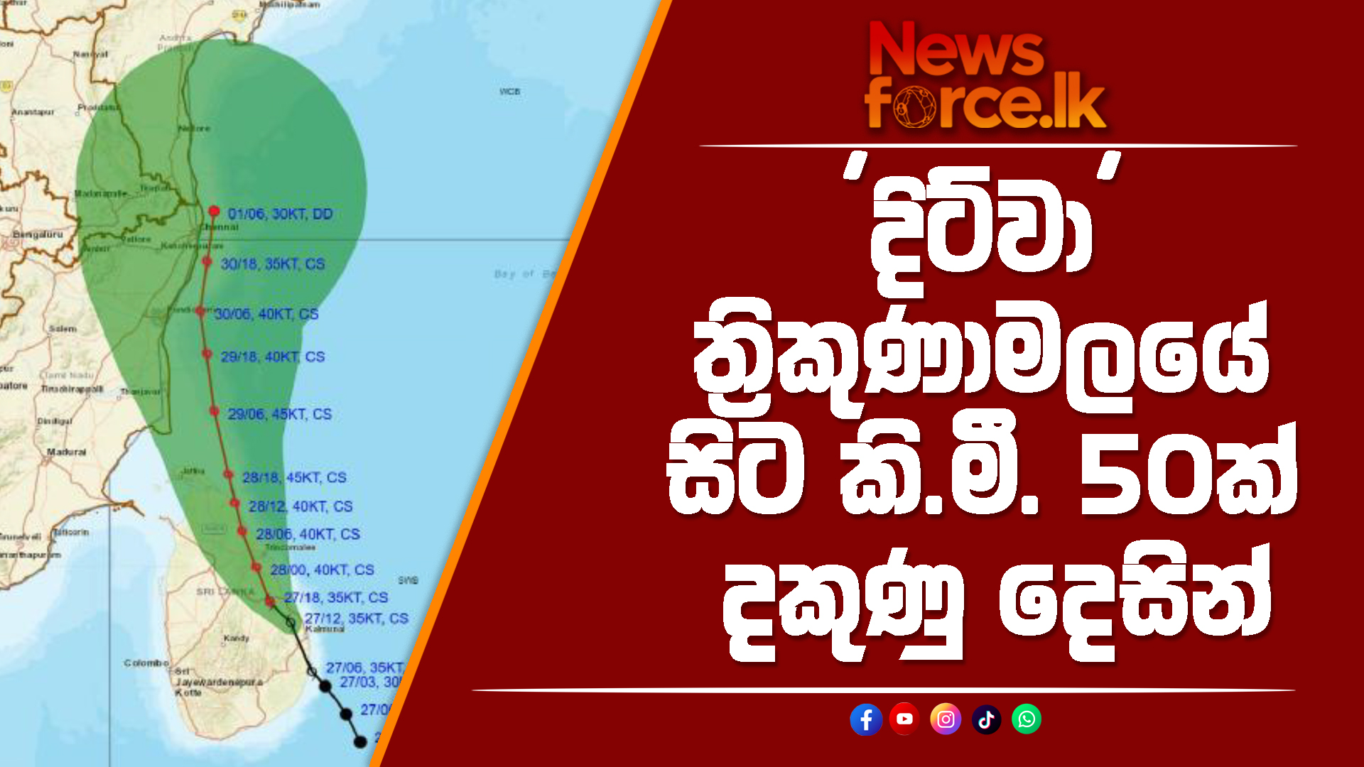 මඩකලපුවට කි.මී. 20ක් නිරිත දෙසින් හමාගිය ‘දිට්වා’ සුළි කුණාටුව මේ වනවිට ත්රිකුණාමලයට කි.මී. 50ක් දකුණු දෙසින් කේන්ද්රගතව තිබේ.