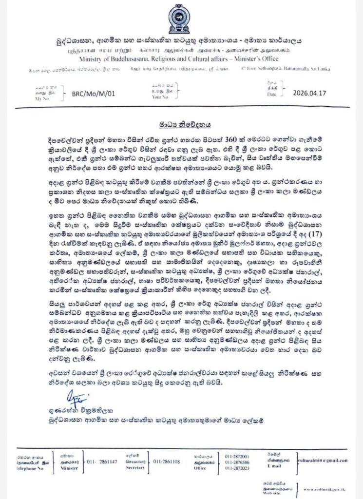 දීපචෙල්වන් ප්රදීපන් රචිත ග්රන්ථ හතරක පිටපත් 360ක් රේගුවේ රඳවා ගෙන ඇති බව බුද්ධශාසන, ආගමික සහ සංස්කෘතික කටයුතු අමාත්යාංශය ප්රකාශ කළා.