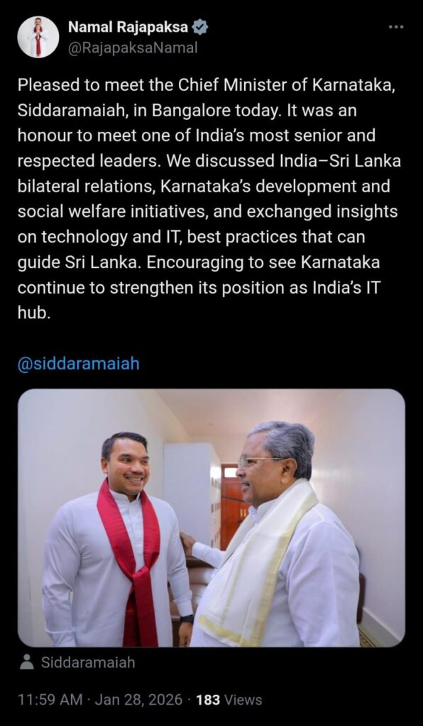 “අද උදෑසන බැංගලෝරයේ දී කර්ණාටක ප්රාන්තයේ මහ ඇමති සිද්ධාරමයියා මහත්මා හමුවීම අතිශය සතුටුදායක අත්දැකීමක් විය. ඉන්දියාවේ අතිශය ජ්යෙෂ්ඨ හා ගෞරවයට පාත්ර වූ නායකයෙකු හමුවීම මට විශාල ගෞරවයක් විය.