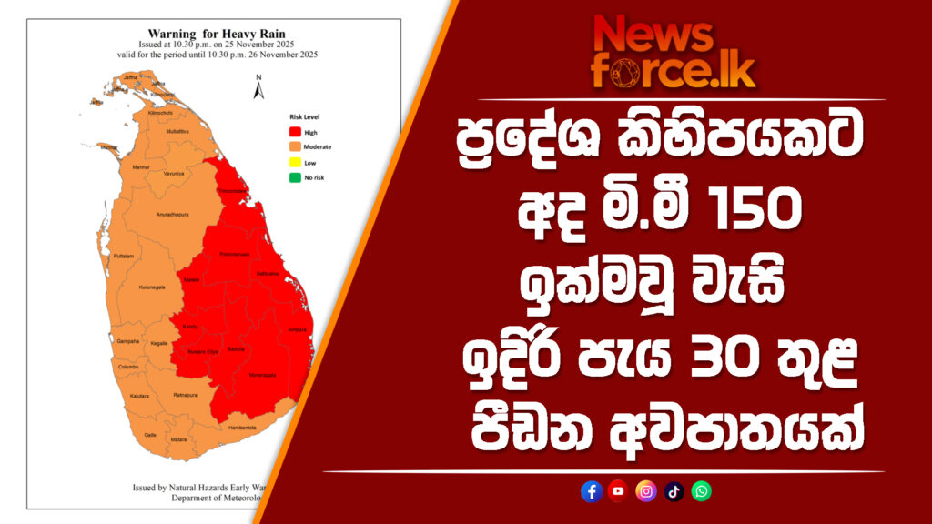 නැගෙනහිර, මධ්‍යම සහ ඌව පළාත්වලත් පොළොන්නරුව දිස්ත්‍රික්කයේත් ඇතැම් ස්ථානවල මි.මී. 150ට වැඩි ඉතා තද වැසි ඇති විය හැකි බව කාලගුණවිද්‍යා දෙපාර්තමේන්තුව නිවේදනය කරයි.