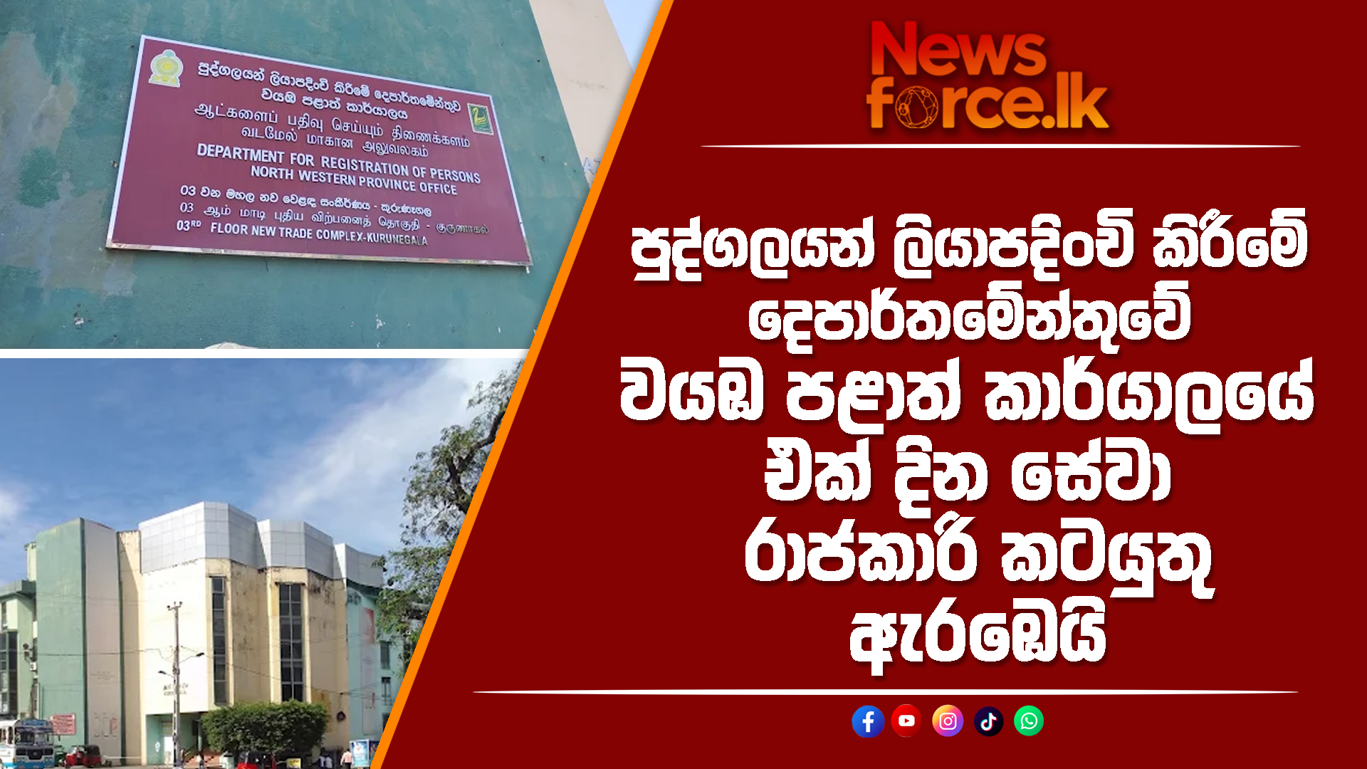 පුද්ගලයන් ලියාපදිංචි කිරීමේ දෙපාර්තමේන්තුවේ වයඹ පළාත් කාර්යාලයේ එක් දින සේවා රාජකාරි කටයුතු අද (03) දින සිට ආරම්භ කළ බව පුද්ගලයන් ලියාපදිංචි කිරීමේ දෙපාර්තමේන්තුව දැනුම් දී තිබේ.