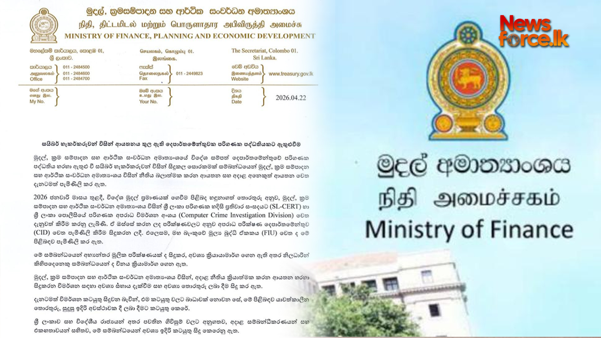 මුදල්, ක්‍රම සම්පාදන සහ ආර්ථික සංවර්ධන අමාත්‍යංශයේ විදේශ සම්පත් දෙපාර්තමේන්තුවේ පරිගණක පද්ධතිය හරහා ඇතුළු වී සයිබර් හැකර්කරුවන් විසින් සිදුකළ සොරකමක් සම්බන්ධයෙන් මුදල්, ක්‍රම සම්පාදන සහ ආර්ථික සංවර්ධන අමාත්‍යංශය විසින් නීතිය බලාත්මක කරන ආයතන සහ අදාළ අනෙකුත් ආයතන වෙත දැනටමත් පැමිණිලි කර ඇත.