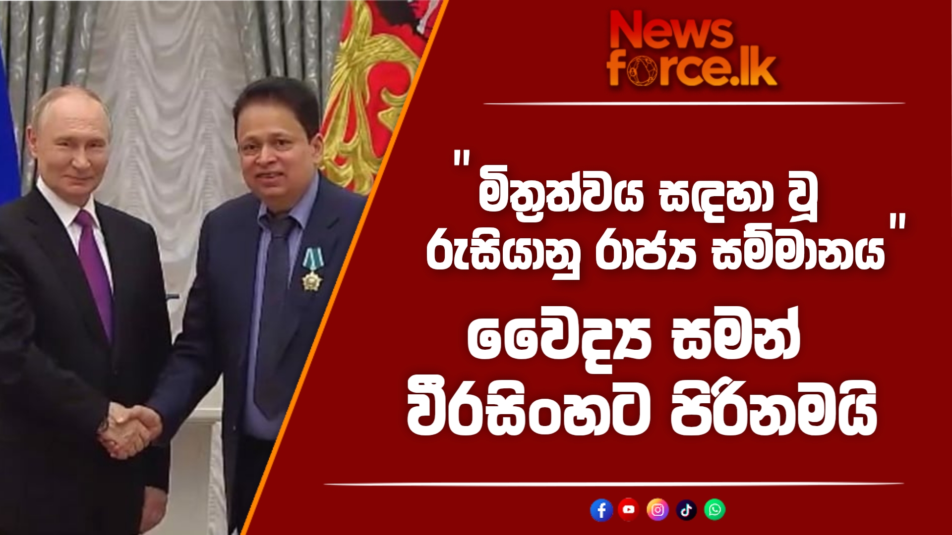 රුසියාවේ හිටපු ශ්‍රී ලංකා තානාපති වෛද්‍ය සමන් වීරසිංහ හට ”මිත්‍රත්වය සඳහා වූ රුසියානු රාජ්‍ය සම්මානය” පිරිනමා තිබෙනවා.