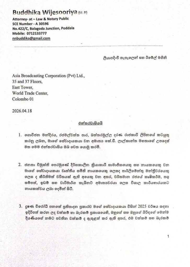 කේ.ඩී ලාල්කාන්ත අමාත්යවරයා හිරු නාලිකාවට බිලියන 10ක එන්තරවාසියක් යවා තිබෙනවා