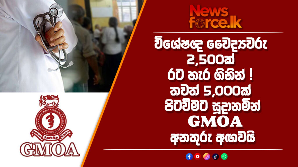 විශේෂඥ වෛද්යවරුන් 2,500ක් පමණ මේ වන විට රාජ්ය සේවය අතහැර රටින් පිටව ගොස් ඇති බව රජයේ වෛද්ය නිලධාරීන්ගේ සංගමය පවසයි.