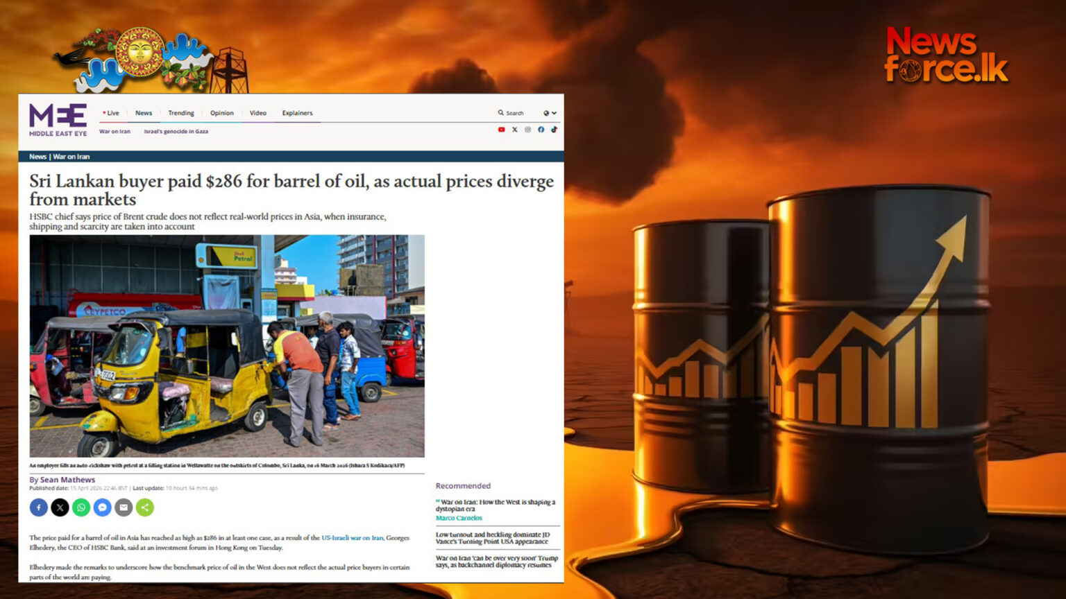 ගෝලීය වෙළෙඳපොළේ බොරතෙල් මිල දර්ශකයන් පවතින මට්ටමට වඩා ඉතා ඉහළ මිලක් ආසියානු කලාපයේ ගැනුම්කරුවන්ට ගෙවීමට සිදුව ඇති බවත්, අවම වශයෙන් එක් අවස්ථාවකදී ශ්‍රී ලංකාව තෙල් බැරලයකට ඩොලර් 286ක් වැනි අතිවිශාල මුදලක් ගෙවා ඇති බවත් HSBC බැංකුවේ ප්‍රධාන විධායක නිලධාරී ජෝර්ජ් එල්හෙඩ්රි (Georges Elhedery) හෙළි කර තිබේ.