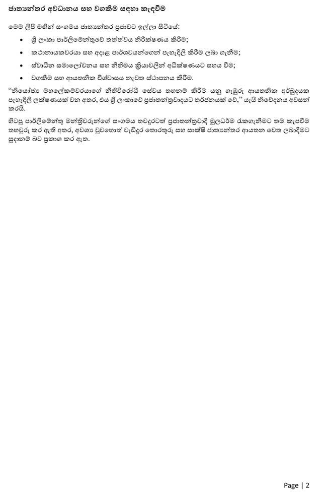 ශ්රී ලංකාවේ හිටපු පාර්ලිමේන්තු මන්ත්රීවරුන්ගේ සංගමය විසින් පොදු රාජ්ය මණ්ඩලයීය පාර්ලිමේන්තු සංගමය, එක්සත් ජාතීන්ගේ මානව හිමිකම් පිළිබඳ මහ කොමසාරිස්ට සහ අන්තර් පාර්ලිමේන්තු සංගමය යන ප්රධාන ජාත්යන්තර ආයතන වෙත, ශ්රී ලංකා පාර්ලිමේන්තුව තුළ ඇති වී ඇති ගැටලුකාරී තත්ත්වයන් පිළිබඳව ලිපියක් මගින් දැනුම් දීමක් සිදුකර ඇත.
