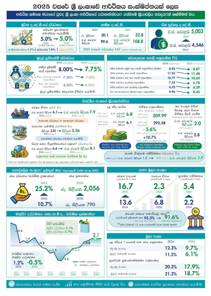 සාර්ව ආර්ථික ස්ථායීතාව අඛණ්ඩව පවත්වා ගැනීම සහ ක්රියාත්මක වෙමින් පවතින ප්රතිපත්තිමය හා ව්යුහාත්මක ප්රතිසංස්කරණ තුළින් අනුබල ලබමින් 2025 වසරේ දී ශ්රී ලංකා ආර්ථිකය පෙර වසර වල දී සාක්ෂාත් කරගත් ප්රගතිය තවදුරටත් ශක්තිමත් කර ගත්තේය. වෙළඳ සහ භූ දේශපාලනික ප්රවණතා ආශ්රිත ගෝලීය අවිනිශ්චිතතා ඉහළ යෑම මෙන්ම, 2025 වසර අග භාගයේ දී ඇති වූ අයහපත් කාලගුණ තත්ත්ව සහ ව්යසනකාරී ස්වාභාවික විපත්වල බලපෑම් මධ්යයේ වුව ද දේශීය ආර්ථික ක්රියාකාරකම්හි ඔරොත්තු දීමේ හැකියාව පැවතිණි. සාර්ව ආර්ථික තත්ත්වයන් වර්ධනය වීම සහ ප්රතිපත්ති ස්ථාවරත්වය වැඩිදියුණු වීම මෙන්ම, ඒ හරහා වැඩිදියුණු වූ ආයෝජක විශ්වාසය මගින් කම්පනවලට වඩාත් ඵලදායීව මුහුණ දීම සඳහා අවශ්ය ස්වාරක්ෂක ගොඩ නැංවීමට ආර්ථිකය සතු හැකියාව වැඩි දියුණු කරමින් තිරසර ආර්ථික වර්ධනයකට මග පෑදුවේය.