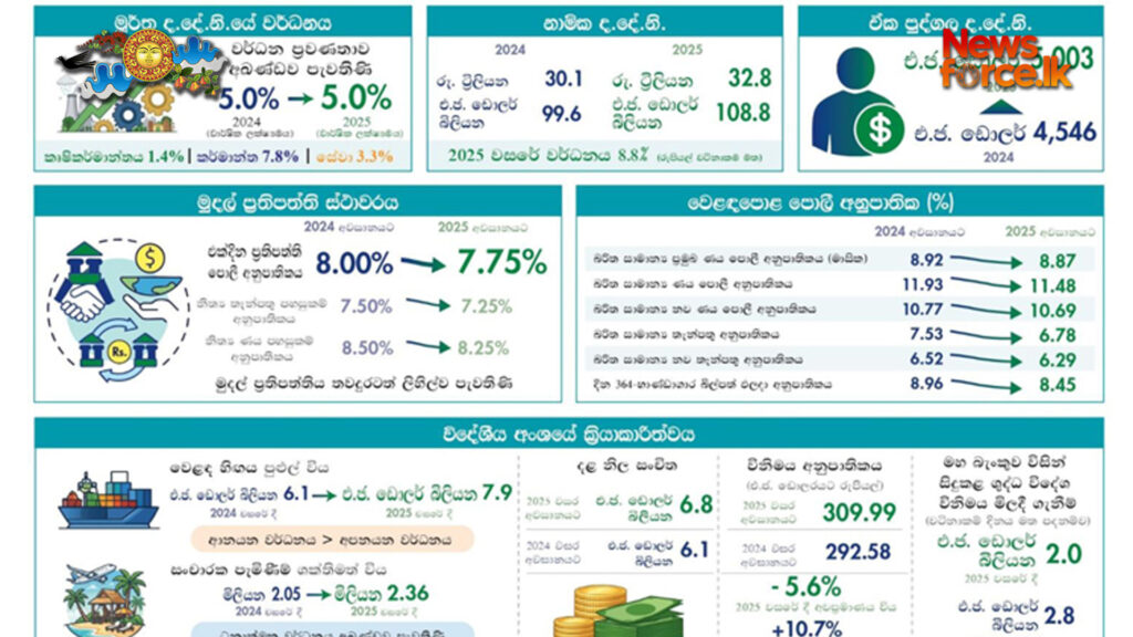 මූර්ත දළ දේශීය නිෂ්පාදිතයේ 5%ක ඇස්තමේන්තුගත වර්ධනයක් වාර්තා කරමින් 2025 වසරේ දී ආර්ථිකය අඛණ්ඩව දෙවන වසරටත් ප්රසාරණය වූ අතර, එමගින් සමස්ත ආර්ථික ක්රියාකාරකම්වල ශක්තිමත් වර්ධනය පිළිබිඹු විය. ආර්ථිකය යථා තත්ත්වයට පත් වීමත් සමඟ ශ්රම වෙළඳපොළ තත්ත්වයන් වර්ධනය විය. අවධමන කාලපරිච්ඡේදයකින් පසුව, ප්රධාන වශයෙන් බලශක්ති ආශ්රිත මිල ගණන් පහළ යෑම අඩු වීම සහ ආහාර මිල ගණන් ඉහළ යෑම හේතුවෙන්, 2025 වසරේ අගෝස්තු මාසයේ දී උද්ධමනය ධන මට්ටමකට පත් වූ අතර, ඉල්ලුම් තත්ත්වය ස්ථාවරව පැවතීම ද මේ සඳහා හේතුවිය. පැවති ලිහිල් මුදල් තත්ත්ව පිළිබිඹු කරමින් පොලී අනුපාතිකවල සිදු වූ පහළ යාම හේතුවෙන් පෞද්ගලික අංශය වෙත ලබාදුන් ණය කැපී පෙනෙන අයුරින් ඉහළ ගියේය. වාහන ආනයන සීමා ඉවත් කිරීම හේතුවෙන් 2025 වසරේ දී ආනයන සහ ණය සඳහා වූ ඉල්ලුම තවදුරටත් ඉහළ ගියේය. වෙළඳ හිඟයේ පුළුල් වීමක් වාර්තා වුවද, විශේෂයෙන් මේ දක්වා වාර්තා වූ ඉහළ ම වැඩිවීමක් පෙන්නුම් කළ විදේශ ප්රේෂණ ලැබීම් සහ වැඩිදියුණු වූ සේවා අපනයනවල සහායයෙන් ජංගම ගිණුම අඛණ්ඩව තෙවන වසරටත් අතිරික්තයක් වාර්තා කිරීමත් සමඟ බාහිර අංශයේ ක්රියාකාරීත්වය තවදුරටත් ශක්තිමත් විය. විදේශීය ණය සේවාකරණ ගෙවීම් මධ්යයේ වුවද, අඛණ්ඩව සංචිත ගොඩනඟා ගැනීම සඳහා මෙම විදේශ විනිමය ලැබීම් හේතු වූ අතර, නම්යශීලී විනිමය අනුපාතික ක්රමය යටතේ ශ්රී ලංකා රුපියල මධ්යස්ථ මට්ටමේ අවප්රමාණය වීමක් වාර්තා කළේය. ආදායම් මත පදනම් වූ රාජ්ය මූල්ය ඒකාග්රතා ක්රියාමාර්ගවල සහායයෙන් රාජ්ය මූල්ය කාර්යසාධනයේ සිදු වූ ශක්තිමත්භාවය පිළිබිඹු කරමින් ප්රාථමික ශේෂය, අඛණ්ඩව තෙවන වසරටත් අතිරික්තයක් වාර්තා කළ අතර, අවදානමට ලක්විය හැකි පිරිස් වෙත අවශ්ය සහාය සැපයීම සඳහා ද වසර තුළ දී අඛණ්ඩව පියවර ගැනිණි. සාර්ව ආර්ථික තත්ත්වයන් ශක්තිමත් වීම මධ්යයේ මූල්ය අංශයේ ක්රියාකාරීත්වය ද වර්ධනය විය. ප්රධාන වශයෙන් ණය ප්රසාරණය ශක්තිමත්වීමේ සහාය ලබමින් වත්කම්වල ගුණාත්මකභාවය සැලකිය යුතු ලෙස ඉහළ යෑමත් සමඟ 2025 වසරේ දී බැංකු සහ බැංකු නොවන මූල්ය ආයතන යන දෙඅංශයේ ම ලාභදායීත්වය ඉහළ ගියේය. බැංකු සහ මුදල් සමාගම්වල ද්රවශීලතාව සහ ප්රාග්ධන ස්වාරක්ෂක වසර තුළ දී අවම නියාමන අවශ්යතාවලට වඩා ඉහළින් පැවති අතර, එමගින් මූල්ය අංශයේ ඔරොත්තු දිමේ හැකියාව පිළිබිඹු කෙරිණි.