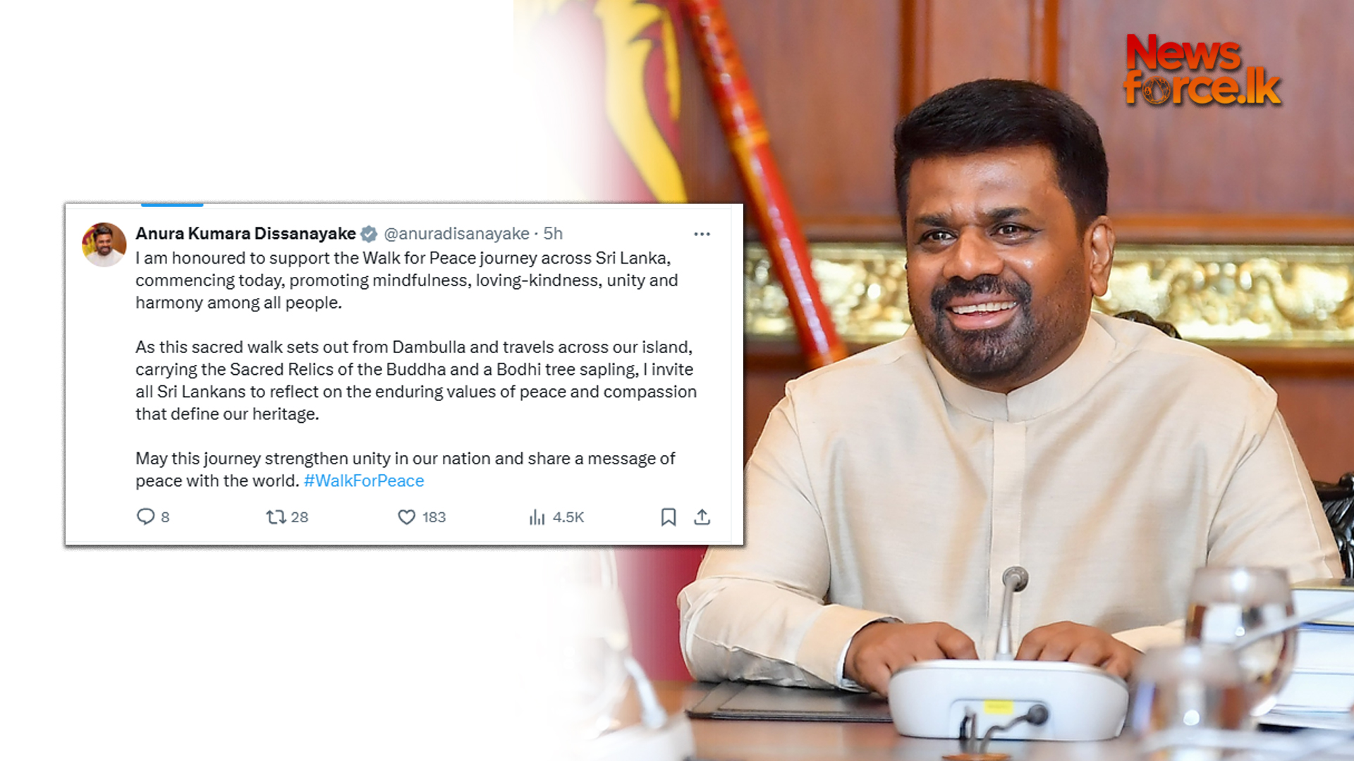 අද (21) සිට මෙරටින් නිල වශයෙන් ආරම්භ වන සාමයේ පා ගමන (Walk for Peace) වැඩසටහන සඳහා ජනාධිපති අනුර කුමාර දිසානායක මහතා සිය පූර්ණ සහයෝගය පළ කර ඇත.