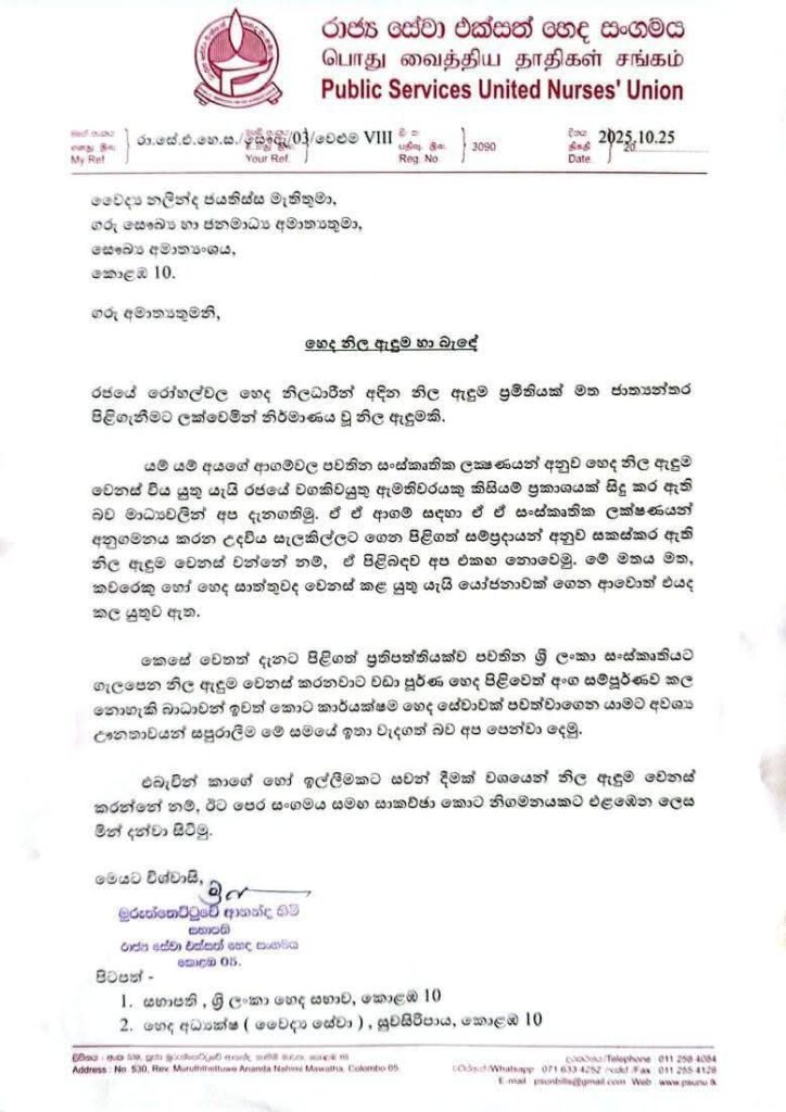 කිසියම් කෙනෙකුගේ ඉල්ලිම මත හෙද නිල ඇදුම වෙනස් කිරීමට පෙර හෙද සංගමය සමඟ සාකච්ඡා කර නිගමනයන්ට එළඹෙන ලෙස රාජ්ය සේවා එක්සත් හෙද සංගමය සිය ලිපියේ සඳහන් කර තිබුණා