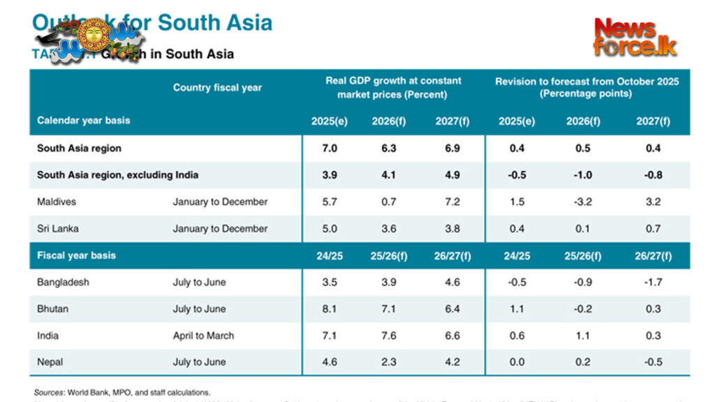 අදාළ වාර්තාවට අනුව 2025 වර්ෂයේ දී දකුණු ආසියානු කලාපයේ වර්ධනය 7% ක් ලෙසින් ඇස්තමේන්තු කර ඇති අතර එය 2026 වසරේ දී 6.3% ක් හා 2027 වසරේ දී 6.9% ක් ලෙසින් පුරෝකථනය කර ඇත.