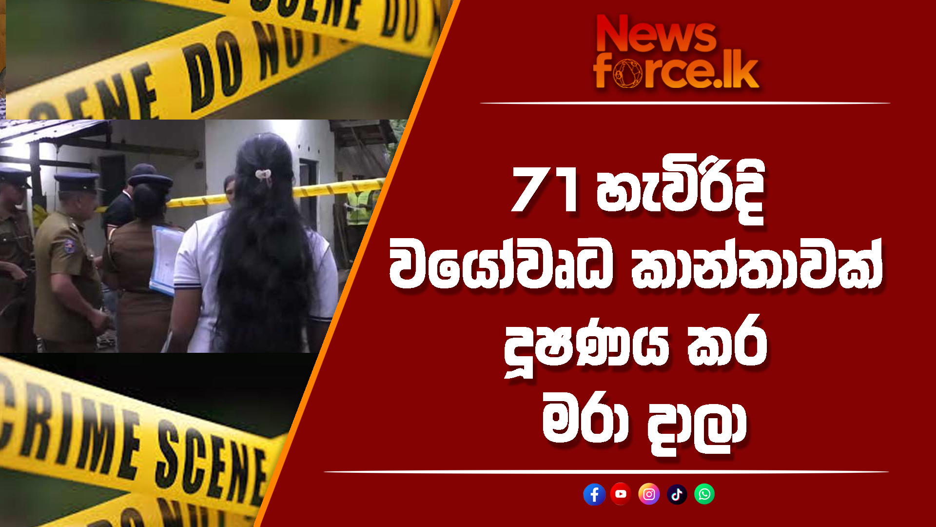 Home»උණුසුම් පුවත්»71 හැවිරිදි වයෝවෘධ කාන්තාවක් දූෂණය කර මරා දාලා