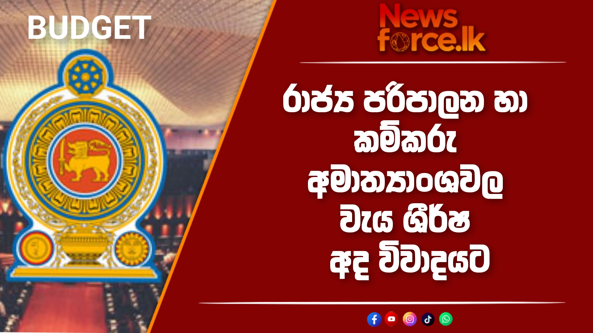අද දිනයේදී රාජ්ය පරිපාලන, පළාත් සභා හා පළාත් පාලන අමාත්යාංශයේ සහ කම්කරු අමාත්යාංශයේ වැය ශීර්ෂ විවාදයට ගැනීමට නියමිතව ඇති බවයි සඳහන් වන්නේ.