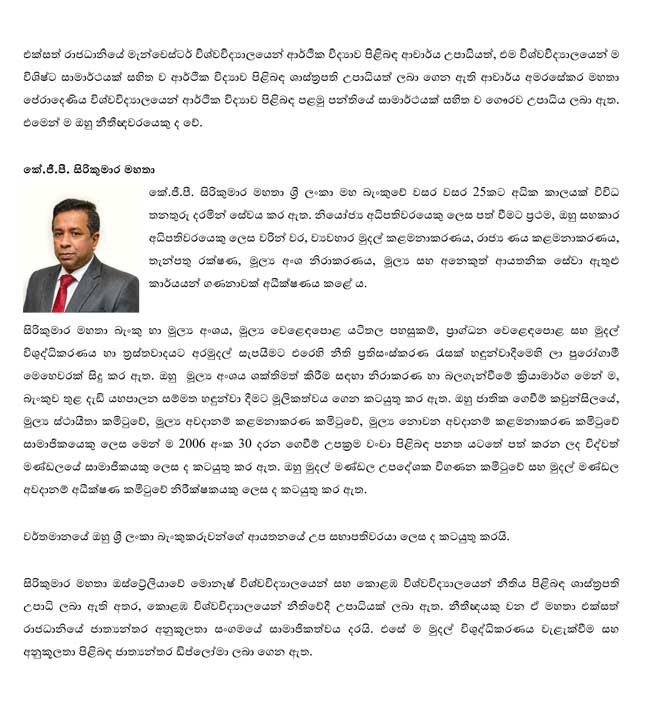 නිවේදනයක් නිකුත් කරමින් මහ බැංකුව සඳහන් කර ඇත්තේ, මුදල් අමාත්යවරයා ලෙස ජනාධිපති අනුර කුමාර දිසානායක මහතා විසින් මෙම පත්කිරීම සිදුකර ඇති බවය.
