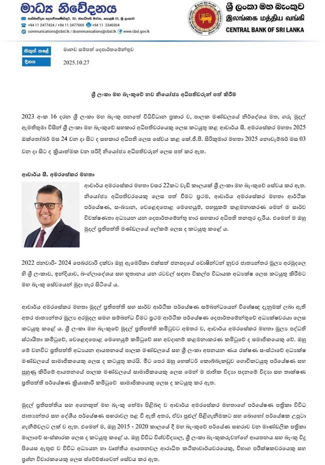 ඒ අනුව ශ්රී ලංකා මහ බැංකුවේ සහකාර අධිපතිවරයෙකු ලෙස කටයුතු කළ ආචාර්ය සී. අමරසේකර මහතා 2025 ඔක්තෝබර් මස 24 වන දා සිට ද සහකාර අධිපති ලෙස සේවය කළ කේ.ජී.පී. සිරිකුමාර මහතා 2025 නොවැම්බර් මස 03 වන දා සිට ද ක්රියාත්මක වන පරිදි නියෝජ්ය අධිපතිවරුන් ලෙස පත් කර ඇත.